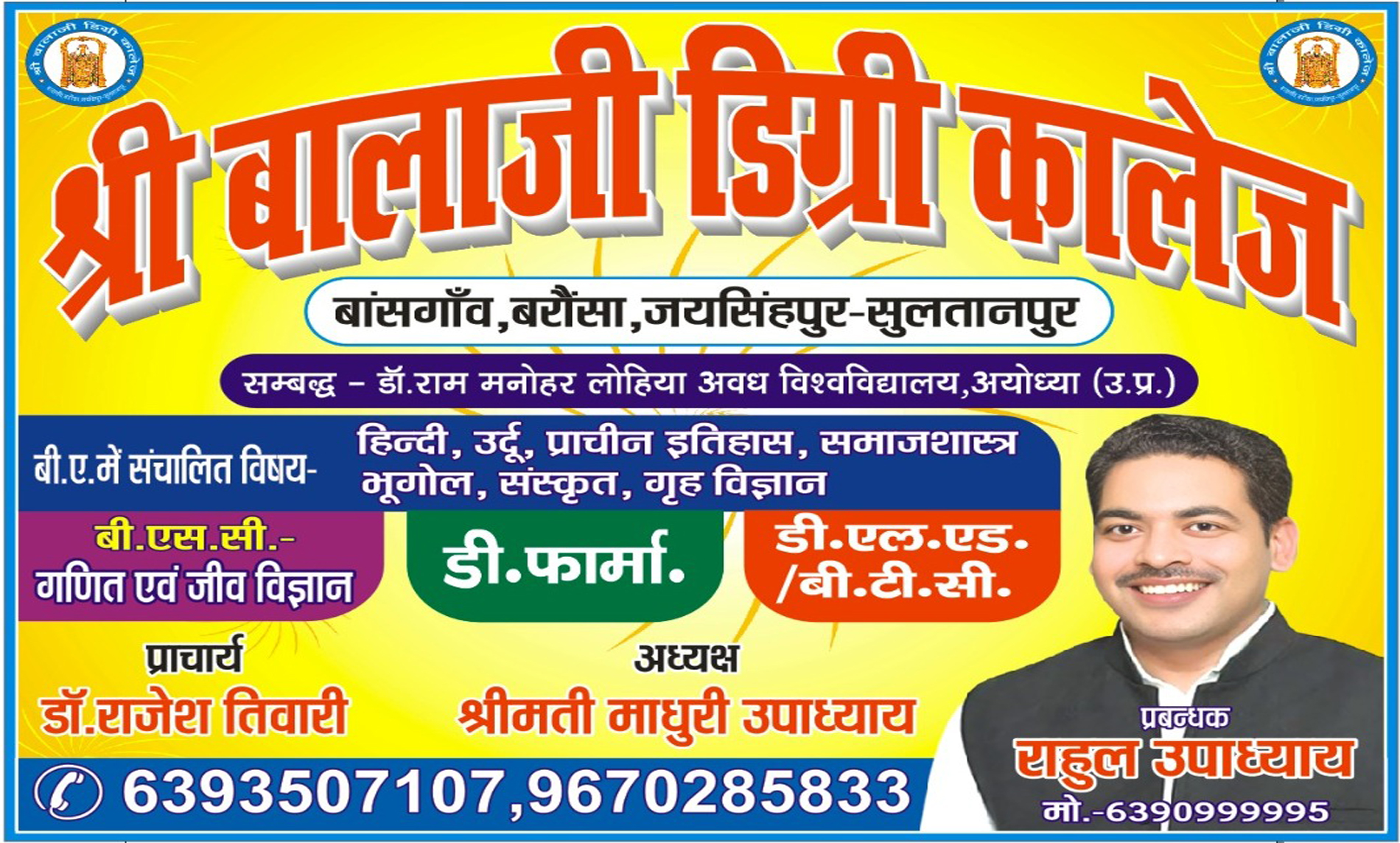Welcome to Shri Balaji Degree College, Bansganv, Baraunsa, Jaisinghpur, Sultanpur. To develop an extension of education in rural areas, the trust Balaji Group of Educational and Charitable Trust founded and registered in 2013 in the chairmanship of Sri. Rahul Upadhyay.